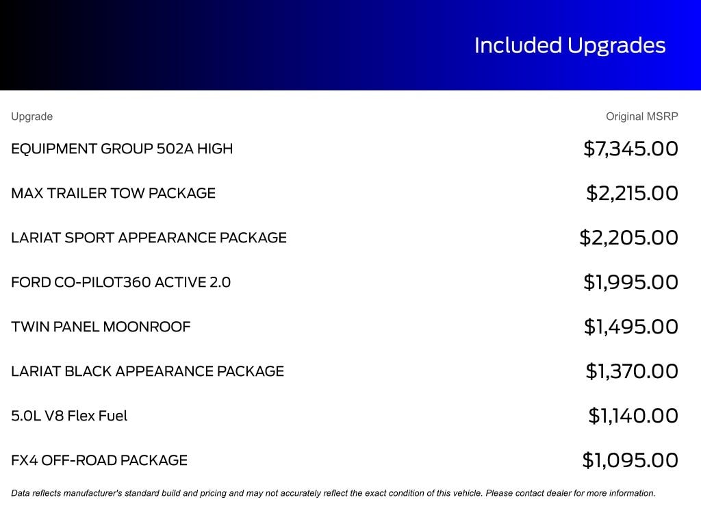 The 502A Package features: Rain-Sensing Wipers, Power Tilt/Telescoping Steering Column w/Memory, Onboard 400W Outlet, 2nd outlet in the console and an additional outlet in the bed, 20" Sport Gloss Black Alloy Wheels, Radio: Premium 18 Speaker Unleashed Sound System by Bang & Olufsen, 2nd Row Heated Seats, High-intensity LED security approach lamps, Universal Garage Door Opener, Heated Steering Wheel, Wireless Charging Pad, LED Projector w/Dynamic Bending Headlamps, and LED tail lamps.