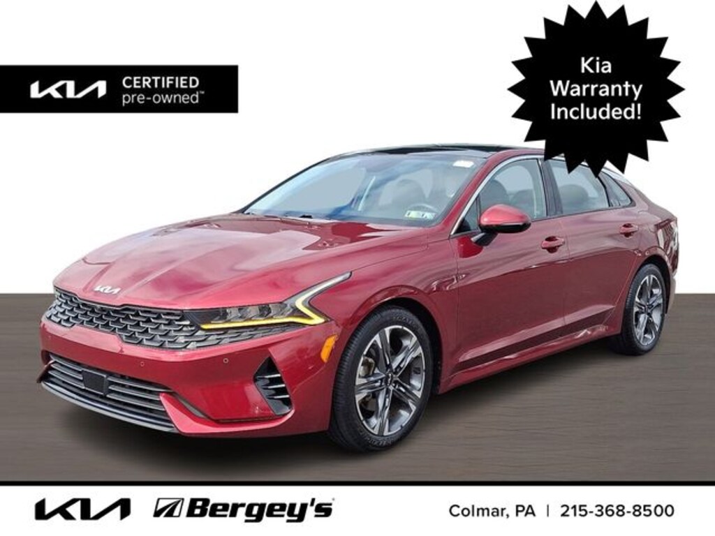 NEW ARRIVAL! SUPER CLEAN KIA CERTIFIED K5 EX!! RED ON BLACK LEATHER! THE RIGHT ONE! SAVE THOUSANDS ON THIS BEAUTIFUL KIA!! ONLY ONE OWNER, CLEAN CARFAX, AND WELL CARED FOR!!! *******AN ORIGINAL BERGEYS KIA CAR. SOLD, SERVICED, AND NOW TRADED BACK TO BERGEYS!!***** COMES FULLY SERVICED W/ NEW PA INSPECTION, OIL CHANGE, A FRESH DETAIL, AND A GREAT WARRANTY!!