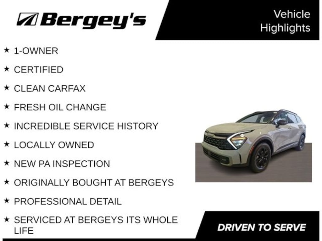Certified. Wolf Gray/Ebony Black Roof 2024 Kia Sportage X-Pro AWD 8-Speed Automatic I4 1-OWNER, CERTIFIED, CLEAN CARFAX, FRESH OIL CHANGE, INCREDIBLE SERVICE HISTORY, LOCALLY OWNED, NEW PA INSPECTION, ORIGINALLY BOUGHT AT BERGEYS, PROFESSIONAL DETAIL, SERVICED AT BERGEYS ITS WHOLE LIFE, AWD.