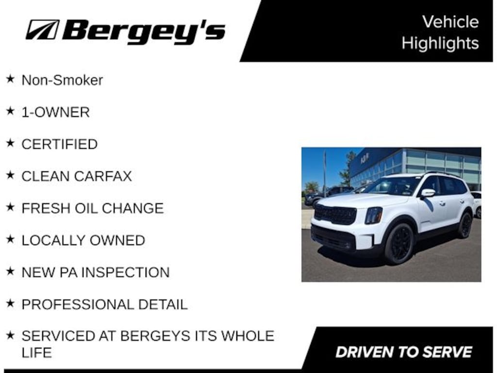Certified. Glacial White Pearl 2025 Kia Telluride SX X-Line AWD 8-Speed Automatic 3.8L V6 DOHC Non-Smoker, 1-OWNER, CERTIFIED, CLEAN CARFAX, FRESH OIL CHANGE, LOCALLY OWNED, NEW PA INSPECTION, PROFESSIONAL DETAIL, SERVICED AT BERGEYS ITS WHOLE LIFE.