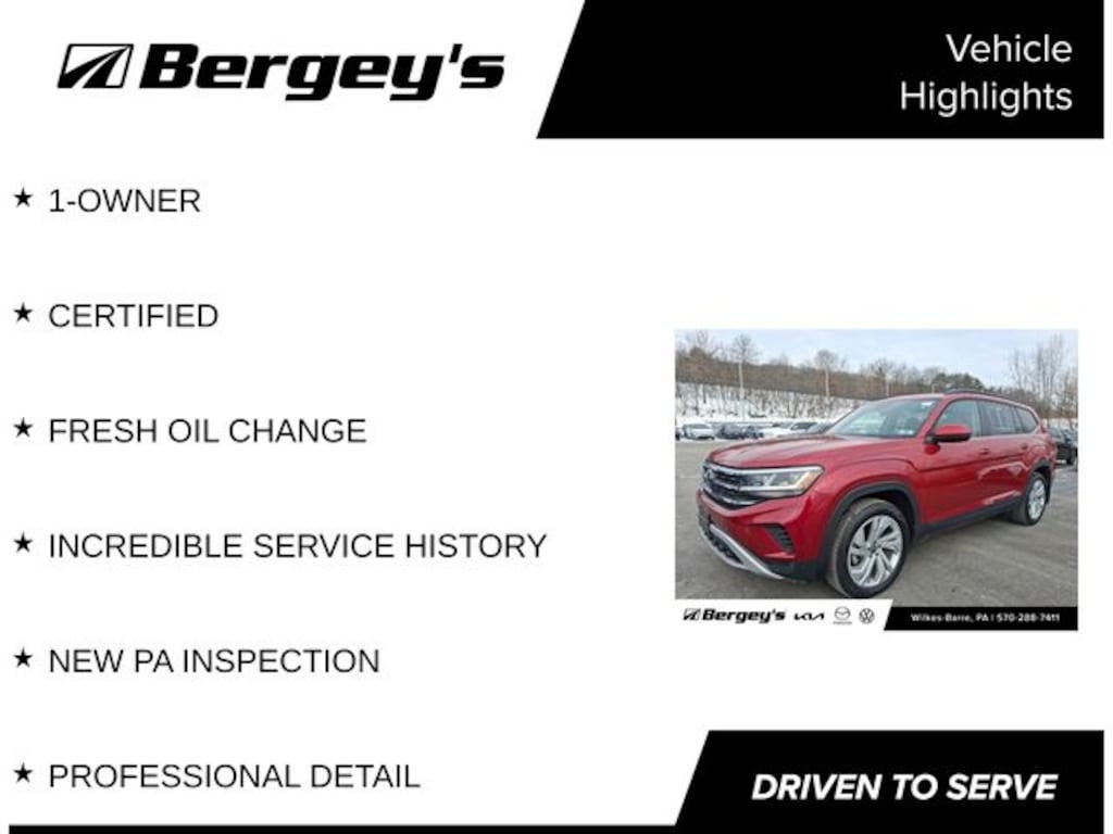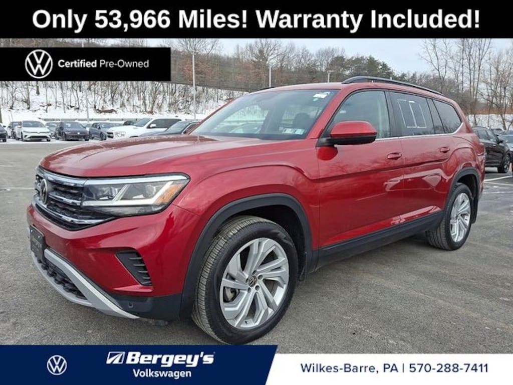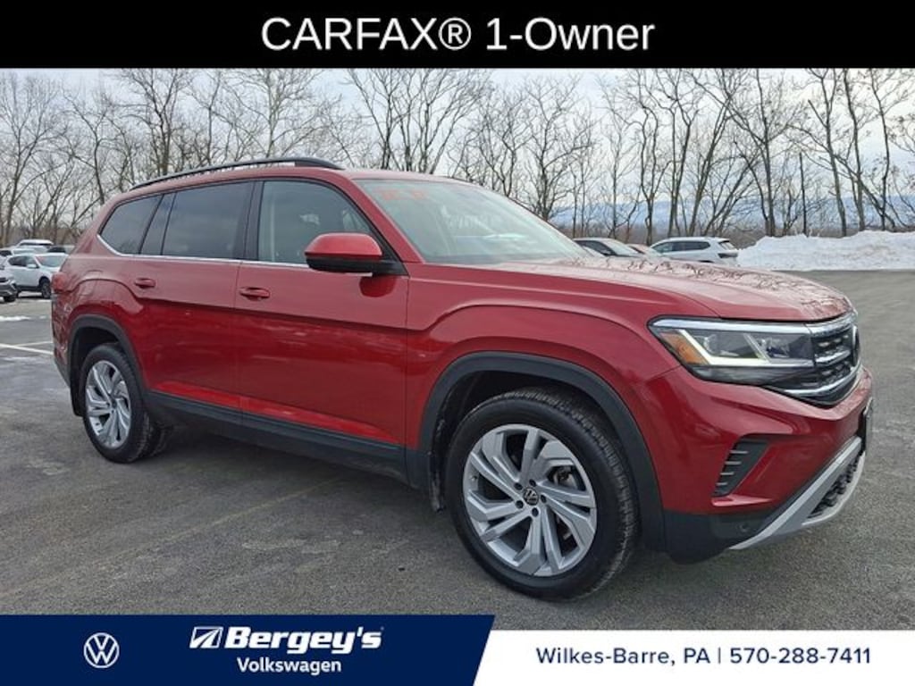 Certified. Aurora Red Metallic 2022 Volkswagen Atlas 3.6L V6 SE w/Technology AWD 8-Speed Automatic with Tiptronic 3.6L VR6 1-OWNER, CERTIFIED, FRESH OIL CHANGE, INCREDIBLE SERVICE HISTORY, NEW PA INSPECTION, PROFESSIONAL DETAIL.