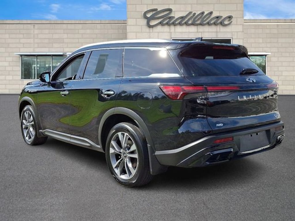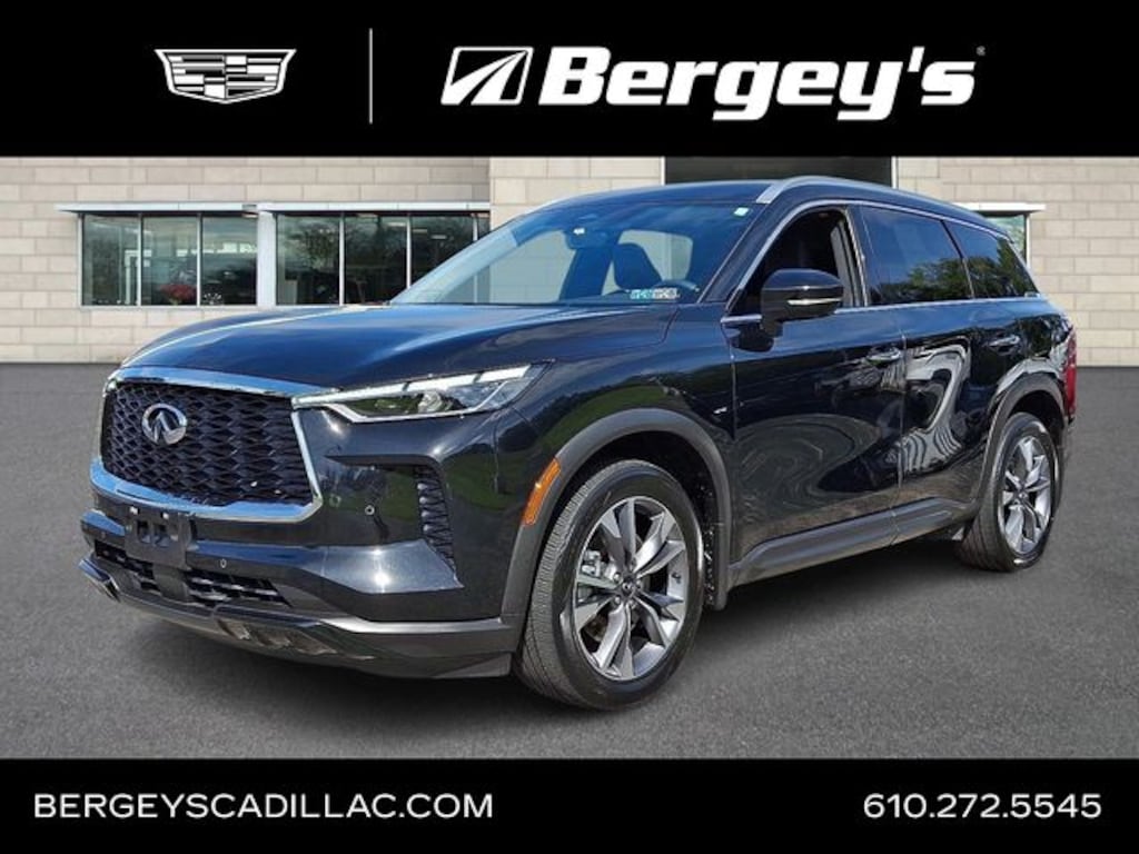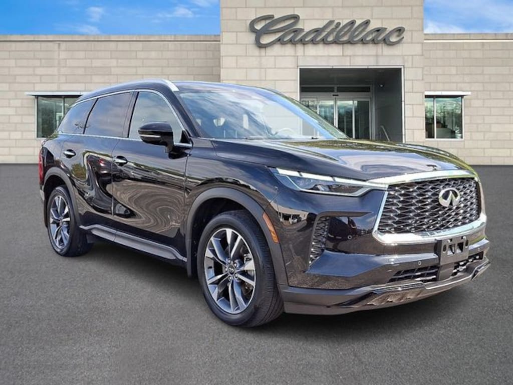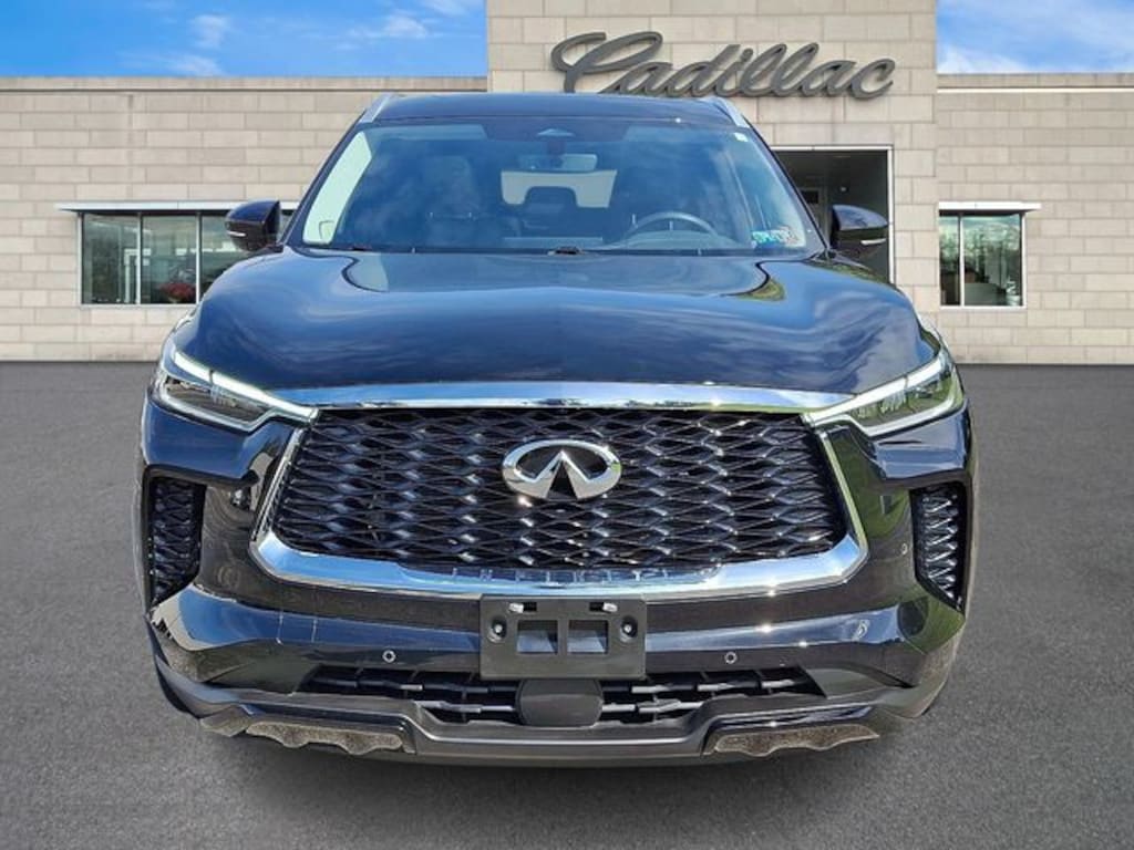 3rd row seats: bench, 4-Wheel Disc Brakes, 4.33 Axle Ratio, 9 Speakers, ABS brakes, Air Conditioning, Alloy wheels, AM/FM radio: SiriusXM, Anti-whiplash front head restraints, Apple CarPlay/Android Auto, Auto High-beam Headlights, Auto tilt-away steering wheel, Auto-dimming door mirrors, Auto-dimming Rear-View mirror, Automatic temperature control, Bose Performance Series 17-Speaker Sound System, Brake assist, Bumpers: body-color, Climate Controlled Front Bucket Seats, Delay-off headlights, Driver door bin, Driver vanity mirror, Dual front impact airbags, Dual front side impact airbags, Electronic Stability Control, Emergency communication system: INFINITI InTouch, Exterior Parking Camera Rear, Floor Mats w/Bench Seats on 3rd Row Tray, Four wheel independent suspension, Front anti-roll bar, Front Bucket Seats, Front Center Armrest, Front dual zone A/C, Front reading lights, Fully automatic headlights, Garage door transmitter: HomeLink, Heated door mirrors, Heated front seats, Heated steering wheel, Illuminated entry, Knee airbag, Leather Shift Knob, Leather steering wheel, Leather-Appointed Seating Surfaces, Literature Kit, Low tire pressure warning, Memory seat, Navigation system: INFINITI InTouch Navigation, Occupant sensing airbag, Outside temperature display, Overhead airbag, Overhead console, Panic alarm, Passenger door bin, Passenger vanity mirror, Performance Audio Package, Power door mirrors, Power driver seat, Power Liftgate, Power moonroof, Power passenger seat, Power steering, Power windows, Radio data system, Radio: AM/FM Audio System, Rain sensing wipers, Rear air conditioning, Rear anti-roll bar, Rear reading lights, Rear seat center armrest, Rear side impact airbag, Rear window defroster, Rear window wiper, Reclining 3rd row seat, Remote keyless entry, Security system, Speed control, Speed-sensing steering, Speed-Sensitive Wipers, Splash Guards (Set of 4), Split folding rear seat, Spoiler, Steering wheel memory, Steering wheel mounted audio controls, Tachometer, Telescoping steering wheel, Tilt steering wheel, Traction control, Trip computer, Turn signal indicator mirrors, Variably intermittent wipers, Ventilated front seats, Wheels: 20" x 8J Sporty Machined Aluminum Alloy. Clean CARFAX. Mineral Black 2024 INFINITI QX60 LUXE AWD 9-Speed Automatic 3.5L V6 DOHC 24V