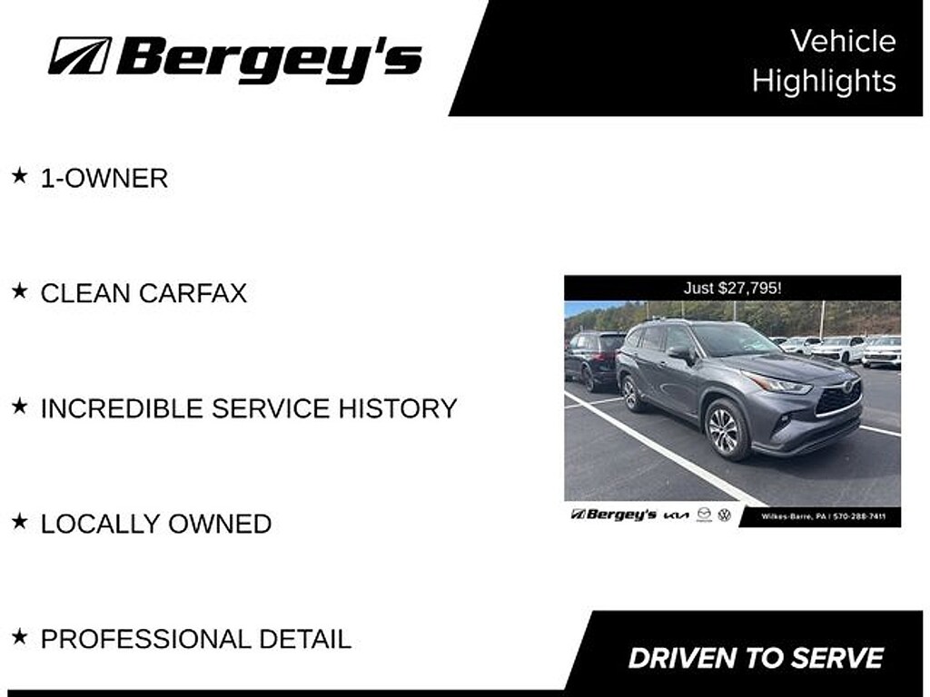 Magnetic Gray Metallic 2020 Toyota Highlander XLE AWD 8-Speed Automatic 3.5L V6 DOHC AWD, 18" Machined Alloy Wheels, 3.003 Axle Ratio, 3rd row seats: split-bench, 4-Wheel Disc Brakes, 6 Speakers, ABS brakes, Air Conditioning, Alloy wheels, AM/FM radio: SiriusXM, Apple CarPlay/Android Auto, Auto High-beam Headlights, Auto-dimming Rear-View mirror, Automatic temperature control, Brake assist, Bumpers: body-color, Delay-off headlights, Driver door bin, Driver vanity mirror, Dual front impact airbags, Dual front side impact airbags, Electronic Stability Control, Emergency communication system: Safety Connect with 3-year trial, Exterior Parking Camera Rear, Four wheel independent suspension, Front anti-roll bar, Front Bucket Seats, Front Center Armrest, Front dual zone A/C, Front fog lights, Front reading lights, Fully automatic headlights, Garage door transmitter: HomeLink, Heated door mirrors, Heated Front Bucket Seats, Heated front seats, Illuminated entry, Knee airbag, Leather Shift Knob, Low tire pressure warning, Occupant sensing airbag, Outside temperature display, Overhead airbag, Overhead console, Panic alarm, Passenger door bin, Passenger vanity mirror, Power door mirrors, Power driver seat, Power Liftgate, Power moonroof, Power passenger seat, Power steering, Power windows, Radio: Audio Plus (T1 Hi), Rear air conditioning, Rear anti-roll bar, Rear reading lights, Rear window defroster, Rear window wiper, Reclining 3rd row seat, Remote keyless entry, Roof rack: rails only, Security system, SofTex Seat Trim, Speed control, Speed-sensing steering, Split folding rear seat, Spoiler, Steering wheel mounted audio controls, Tachometer, Telescoping steering wheel, Tilt steering wheel, Traction control, Trip computer, Turn signal indicator mirrors, Variably intermittent wipers, 1-OWNER, CLEAN CARFAX, INCREDIBLE SERVICE HISTORY, LOCALLY OWNED, PROFESSIONAL DETAIL, AWD.